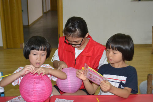 做完灯笼后哥哥姐姐们便带着小宝贝折了一个爱心,还在上面写了祝福语,志愿者们引导着小宝贝们把灯笼送给我们老师,当我们听到孩子那一句:“老师,谢谢您!”的时候,心里都乐开花了。